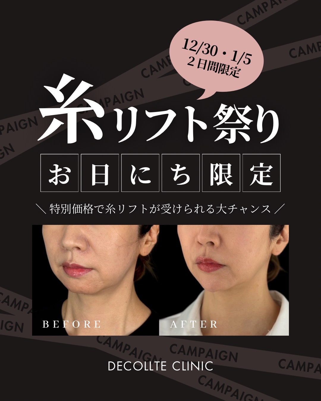 ⸻ 【ご予約について】 糸リフトをご希望の方は、 まずは《事前診察》をお願いいたします。 適応が確認できた場合は 施術日2週間前までのご入金をお願いしております。 ※期限後のキャンセルには キャンセル料が発生いたします。ご了承くださいませ。 ⸻ 今年のうちに、 そして新しい年のはじまりに。 「引き上がった自分」を叶える特別な2日間! ご予約お待ちしております ┈┈┈┈┈┈┈┈┈┈┈┈┈┈┈ 芦屋デコルテクリニック 0797-38-6334 @decollte.clinic