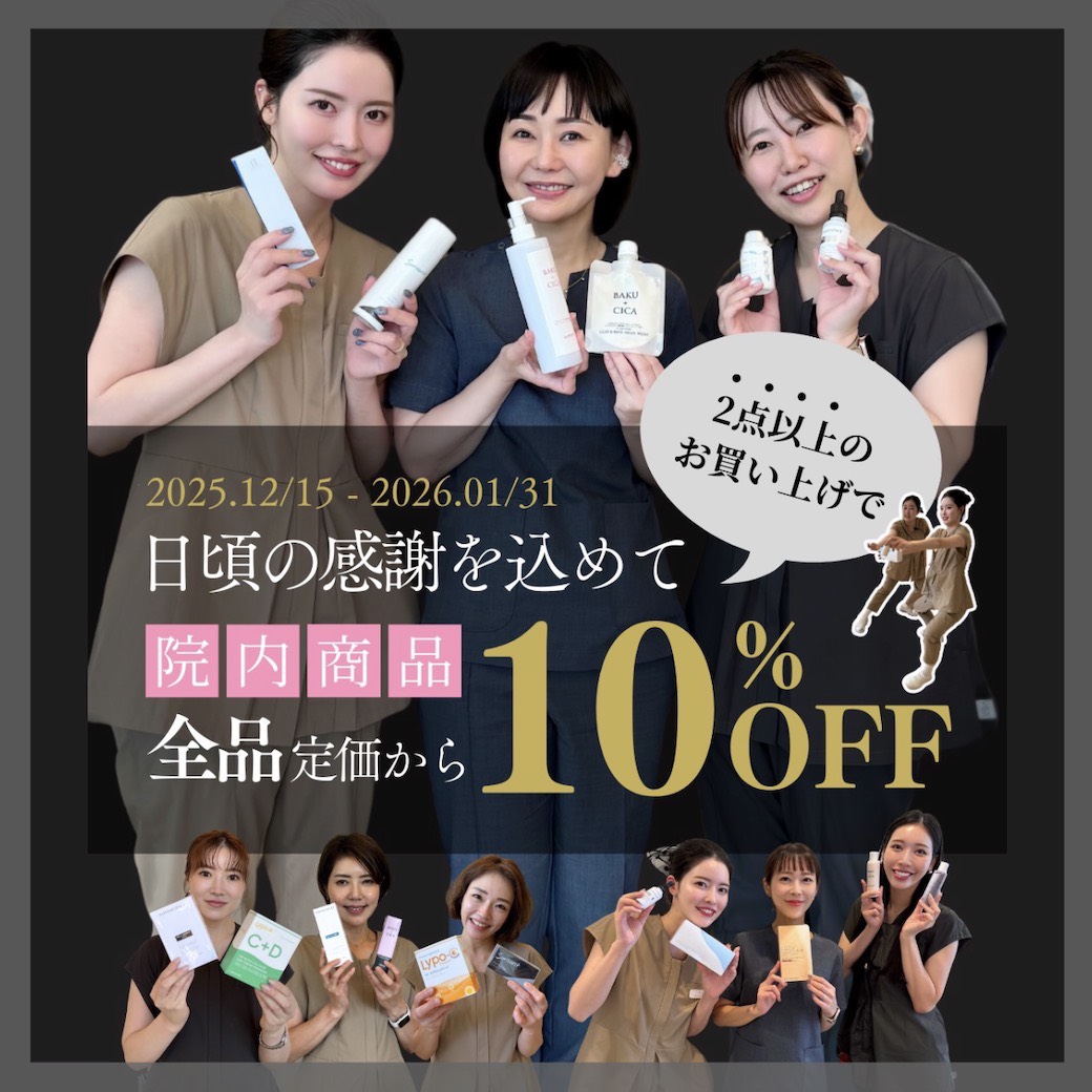 2025年も残すところあとわずかとなりました😌 本年もたくさんの方に足を運んでいただき、スタッフ一同感謝の気持ちでいっぱいです。 そんな日頃の感謝を込めまして『院内商品2点以上お買い上げ』で、全品10%オフにてご提供させていただきます✨