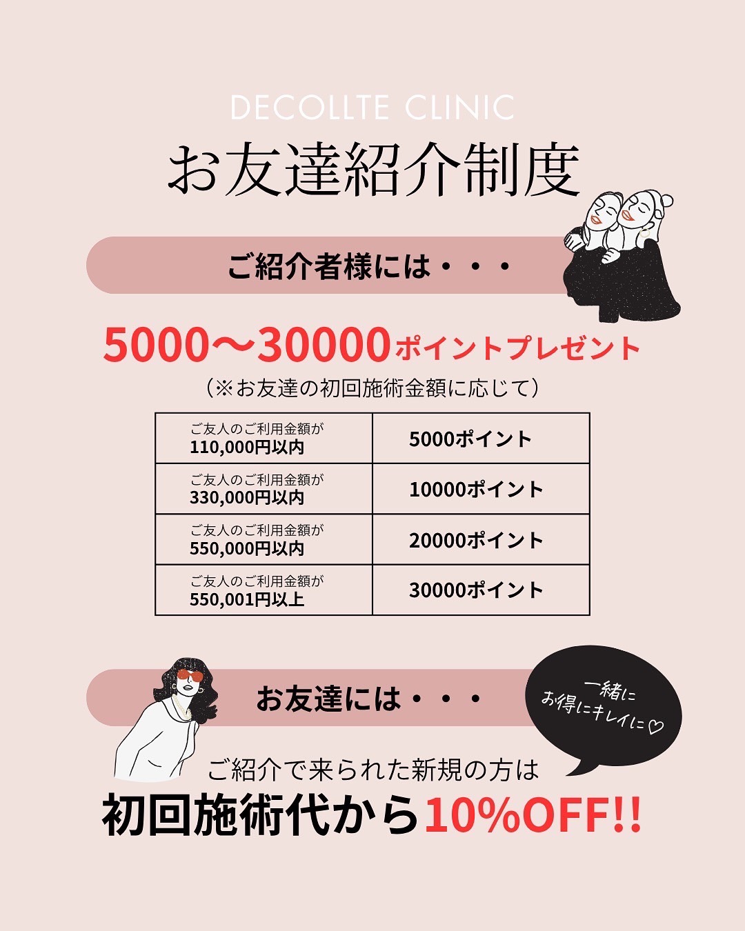 ① ご紹介者様には ▶︎ 5000〜30000ポイントプレゼント♡ (※お友達の施術内容に応じて) ② ご紹介でご来院のご新規様には ▶︎ 初回施術代【10%OFF!!】  ̄ ̄ ̄ ̄ ̄ ̄ ̄ ̄ ̄ ̄ ̄ ̄ ̄ ̄ ̄ ̄ ̄ ̄ ☑️ご紹介は何名でもOK ☑️ポイントは施術・商品に利用可能◎ 大切な人と一緒に、美容の時間をもっと楽しく 気になる施術を始めるきっかけにもぴったりです! ぜひこの機会にご活用ください☺️✨✨
